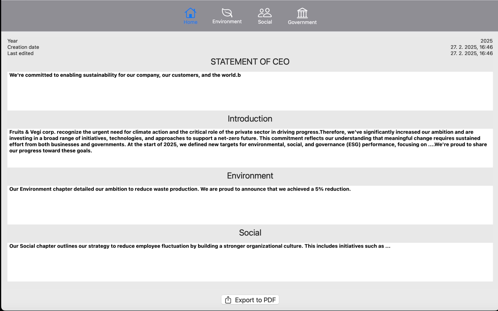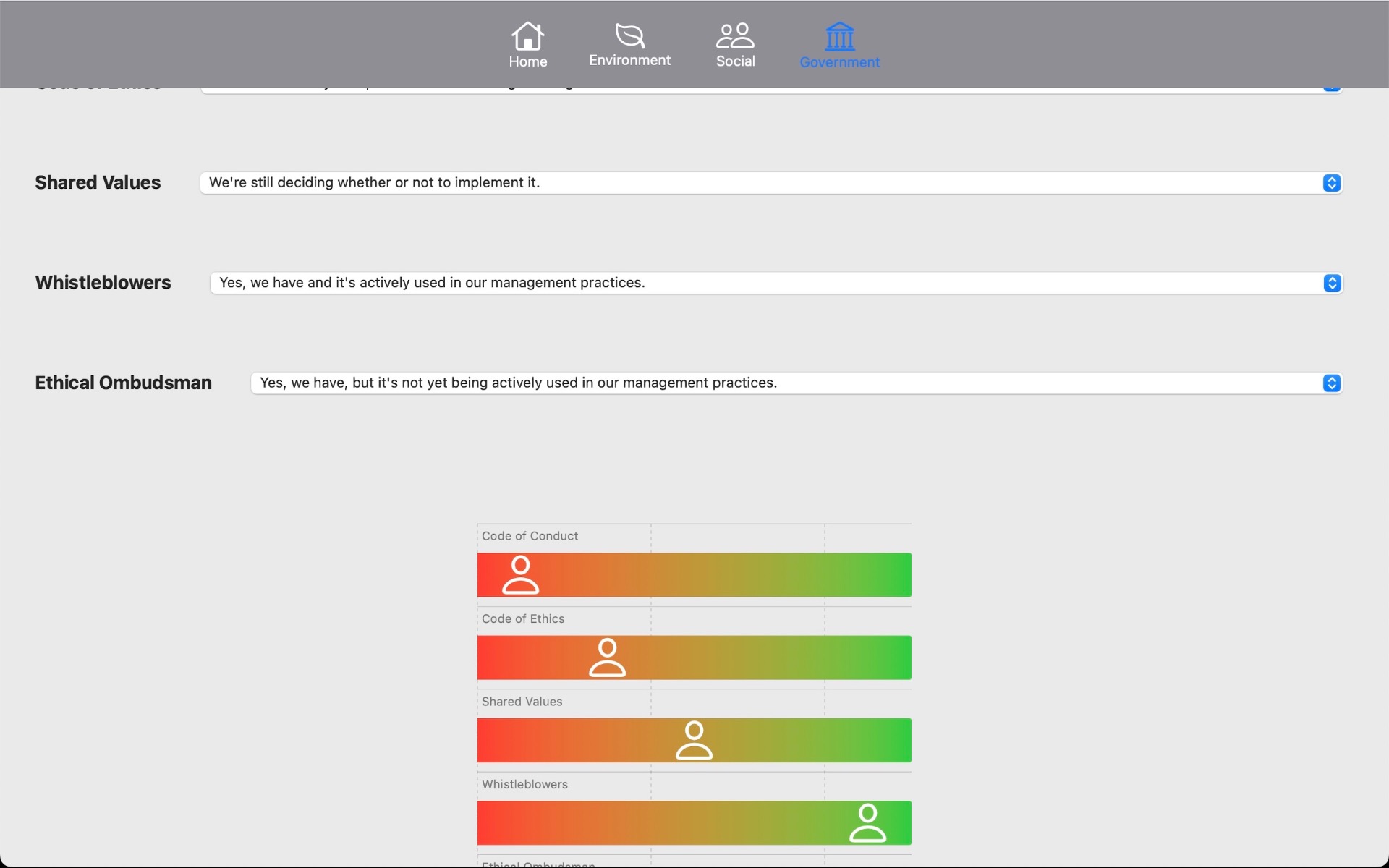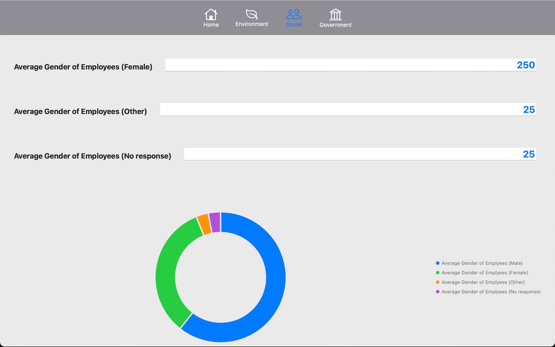 Achieve a clear and comprehensive understanding of your ESG performance with the ESG REPORTING app. Our advanced platform simplifies the often complex process of ESG analysis, delivering the granular data and actionable insights you need to effectively drive your sustainability initiatives. Generate accurate, comprehensive, and compliant ESG reports, identify key areas for improvement across all ESG pillars, and confidently showcase your organization's dedication to a more sustainable future for your stakeholders, your community, and the planet.